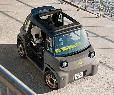 The 2025 Citroën Ami Buggy brings open-air adventure to the city. This all-electric two-seater features metal hoop doors, a soft-top sunroof, gold 14″ wheels, and 46 miles of range – perfect for zipping through Europe at 28 mph in rugged style.