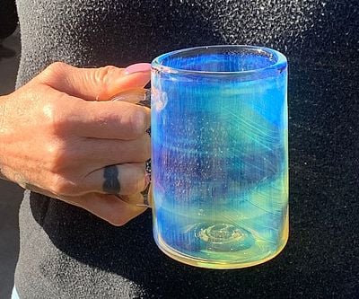 Sip in style with the Color Changing Iridescent Glass Mug, hand-blown from durable borosilicate glass. Watch it shift from golden yellow to deep blue when filled with dark liquids. Lead-free, dishwasher and microwave safe, holds 16 oz of magic.
