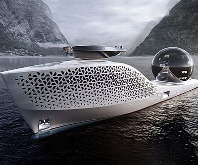 The Earth 300 Explorer Vessel concept is a futuristic research vessel unlike any before it. This impressive giga yacht can house hundreds of scientists and researchers, is powered by nuclear tech, and boasts a massive science sphere equipped with 22 laboratories.