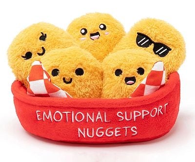 Emotional Support Chicken Nuggets deliver cozy comfort with a side of humor. Each plush nugget has its own quirky face and personality, tucked inside a soft container. Perfect as cuddly companions, gag gifts, or whimsical decor for nugget lovers everywhere.