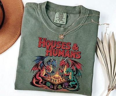 Flip the script with the Houses and Humans D&D Shirt. Four dragons sit around a table role-playing boring suburban life – mortgages, lawns, HOA meetings. A geeky retro gag tee for dice rollers who enjoy meta-humor in their campaigns.