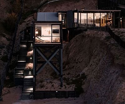 Carved into Chile’s coastal cliffs, the HRMTZ House blends bold geometry with raw nature. Two pine-clad volumes – one stilted, one nestled – connect via a central bridge, offering panoramic sea views, and a windswept, wood-scented dreamscape.