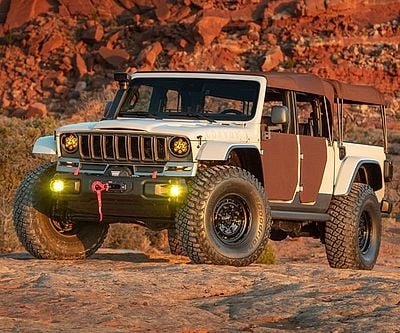 The Jeep Gladiator Convoy Concept blends military grit with retro flair. With a J-truck hood, 40-inch tires, a winch, and canvas top, it’s battle-ready outside – and surprisingly bougie inside, with club chair leather and a bed-lined dash. It’s truly salute-worthy!