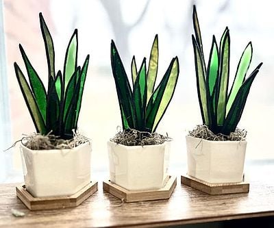 These Miniature Stained Glass Snake Plants bring everlasting greenery to any space. Handcrafted with translucent and opaque green glass, each 8-9″ piece features eight polished leaves in silver or black patina, customizable for your perfect sunlit display.