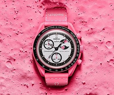 The OMEGA x Pink Moonphase MoonSwatch blends bold color with lunar elegance. Featuring a pink Bioceramic case, moon phase complication, UV-revealed message, and Super-LumiNova accents, it celebrates playfulness, and precision.
