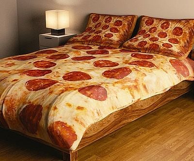 Experience the most delicious night of sleep of your life by laying down on the pepperoni pizza bed set. This appetizing bed set comes emblazoned with a mouth watering pepperoni cheese pizza graphic so realistic you can practically see the grease dripping to the floor.