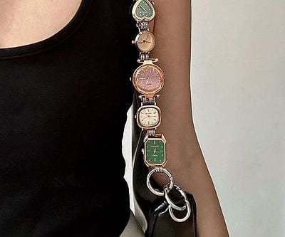 Turn your bag into a punk-chic statement with this handcrafted watch face chain. Featuring vintage-style, colorful timepieces in rose gold, green, and lavender, it’s both art and attitude. It’s functional, fabulous, and detachable.
