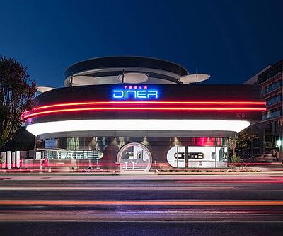 Cruise into the future at the Tesla Diner, a retro-futuristic 24/7 hotspot with rooftop seating, drive-in movies, diner classics, and 80 V4 Superchargers. Enjoy chili in a Cybertruck box while watching movies on twin 66-foot LED screens.