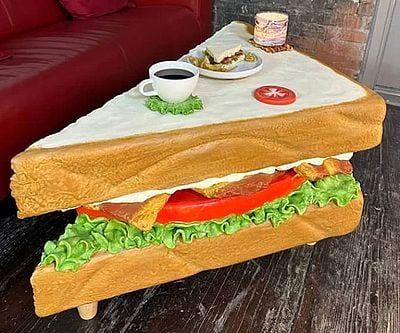 Serve up serious style with the BLT Sandwich Table – a hilariously lifelike, hand-sculpted coffee table that looks like a giant half of your favorite sandwich. With layers of mayo, bacon, lettuce, tomato, and bread, it’s deliciously absurd and surprisingly functional.