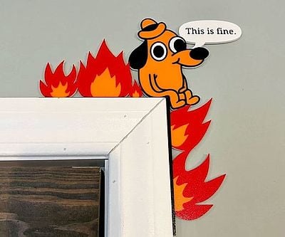 Spice up your space with the This Is Fine Door Frame Decoration. Featuring the iconic meme dog calmly surrounded by flames, this corner-mounted piece adds a perfect dose of chaos and humor to any room, no fire extinguisher required.
